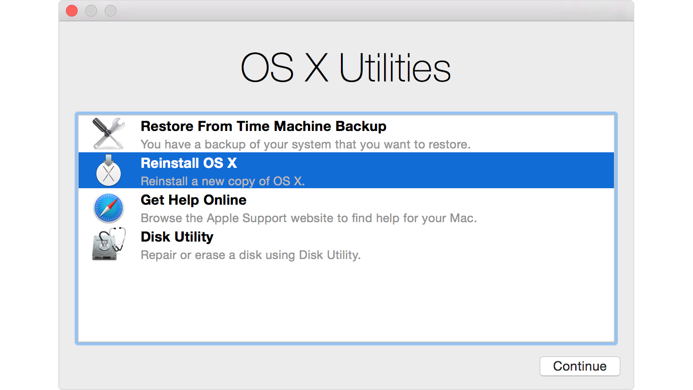 Когато горните стъпки са изпълнени, на екрана на вашето OS X устройство ще се появи въртящ се глобус, който сигнализира, че желаният Internet Recovery режим се зарежда. Веднага, след като необходимата информация бъде изтеглена, ще видите наподобяващ на OS X Utilities прозорец, който ви позволява както да инсталирате и преинсталирате, така и да възстановите предварително направен от вас Time Machine Backup.